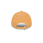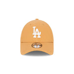 The Los Angeles Dodgers MLB Essentials Wheat 9FORTY Adjustable features an embroidered white Dodgers logo on the front panels of a structured crown with a NE Flag logo on the left, and an adjustable d-ring enclosure at the back.