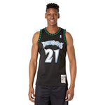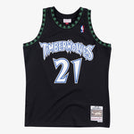 The Minnesota Timberwolves debuted their new third jersey in 1997-98. The black jersey was an instant hit and became a staple of the Twolves uniforms for years to come. Third year All-Star Kevin Garnett had another stellar season averaging 18.5 points, 9.6 rebounds and 1.8 blocks per game. The Wolves made their second consecutive post-season appearance in 1998, falling to the Sonics in five games. Founded in 1989, the Timberwolves got their name as Minnesota is the home to the largest population of timberwolves in the lower 48 states.