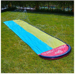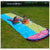 2 sliding lanes for racing Wall of water on the bumper Easy to setup - simply connect the garden hose and go! Recommended for ages 5-12 Dimensions (approx. m): 4.8 (L)