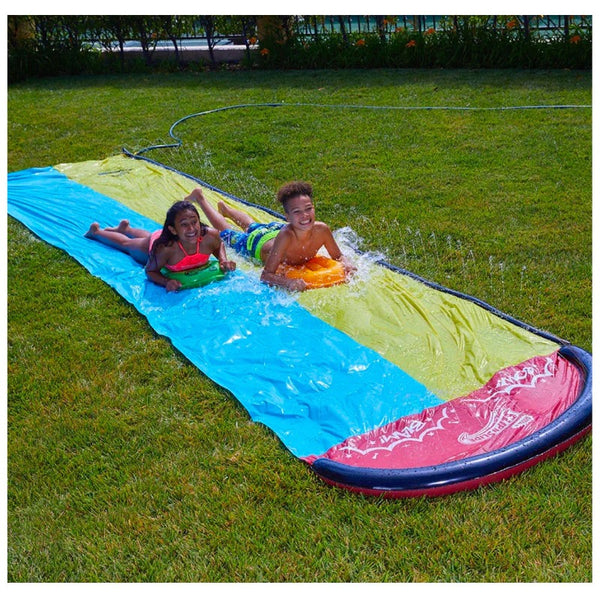 It's time to get outdoors with the Slip 'N Slide Double Wave Rider! Complete with 2 boogie boards to slide even faster across the lawn, it features 2 lanes for racing your brother or sister, wall of water on the bumper and only requires a garden hose connection so you can get sliding right away!