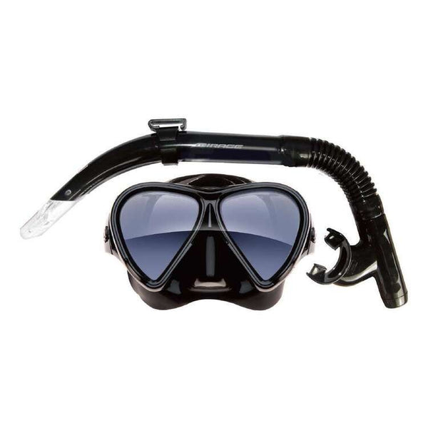 Mirage Eclipse Adults Mask & Snorkel Set, the hi grade black silicone skirt provides greater visibility by eliminating sidelight. Reflective tempered glass lens, purge snorkel with silicone mouthpiece and splash guard for enjoyable trouble-free snorkelling
